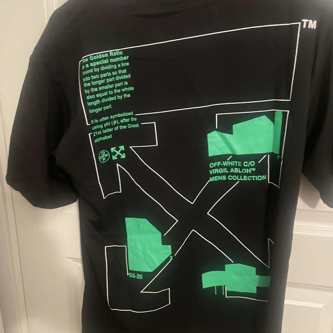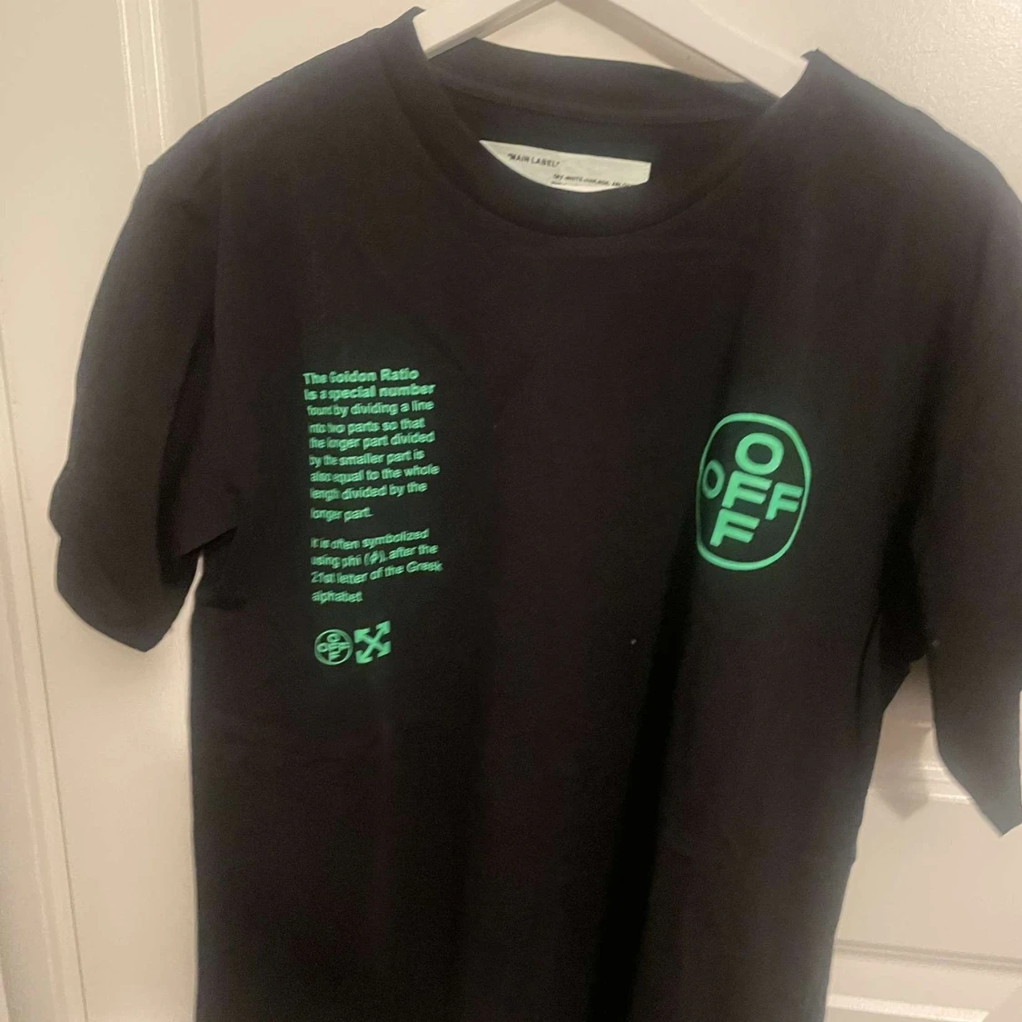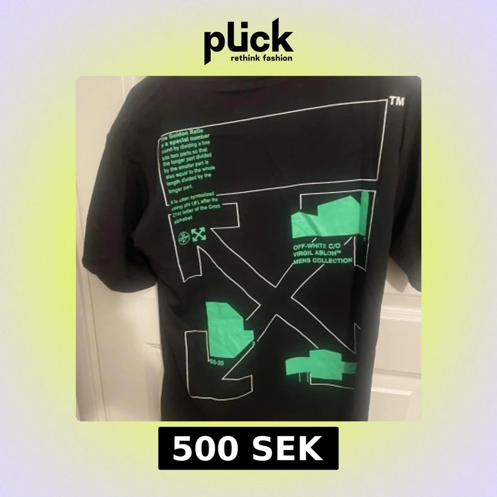 Snygg svart t-shirt från Off-White med grönt grafiskt tryck och text både fram och bak. Stora Off-White-loggor och detaljerad design med modern vibe. Klassisk passform och rund hals. Perfekt för dig som gillar streetwear och vill sticka ut.
