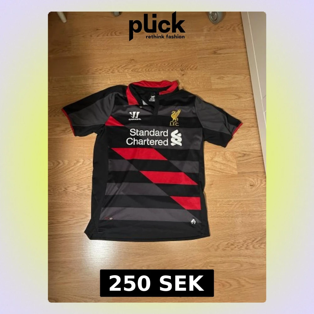Säljer en Liverpool FC fotbollströja från Warrior i svart och grått med röda diagonala ränder och detaljer. Tröjan har korta ärmar, röd krage och klubbmärke i guld på bröstet. Materialet är lätt polyester, perfekt för fotboll och sport.