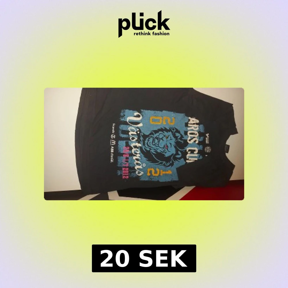 Svart t-shirt från Aros Cupen Västerås 2012 med stor tryckt lejon-design i blått, vitt och gult på framsidan. T-shirten har korta ärmar, rund hals och är gjord i mjuk bomull. Tryck med turneringsdatum och sponsorer som McDonald's, ABB och Coca-Cola.