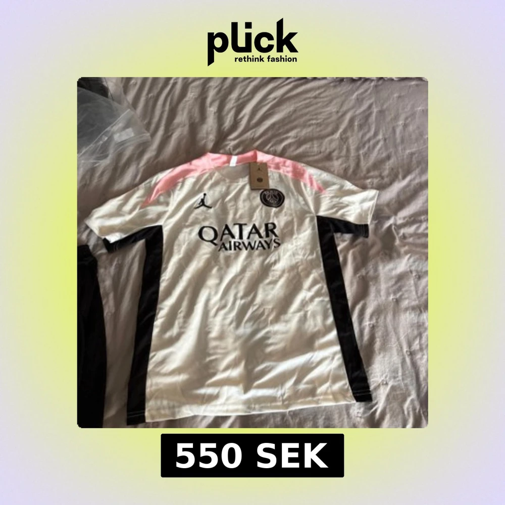 Säljer en PSG x Jordan fotbollströja i vitt med svarta detaljer och rosa axelparti. Tröjan har korta ärmar, broderad PSG-logga och Jordan-logga på bröstet samt Qatar Airways-tryck. Tillverkad i lätt och ventilerande material, perfekt för match eller träning.