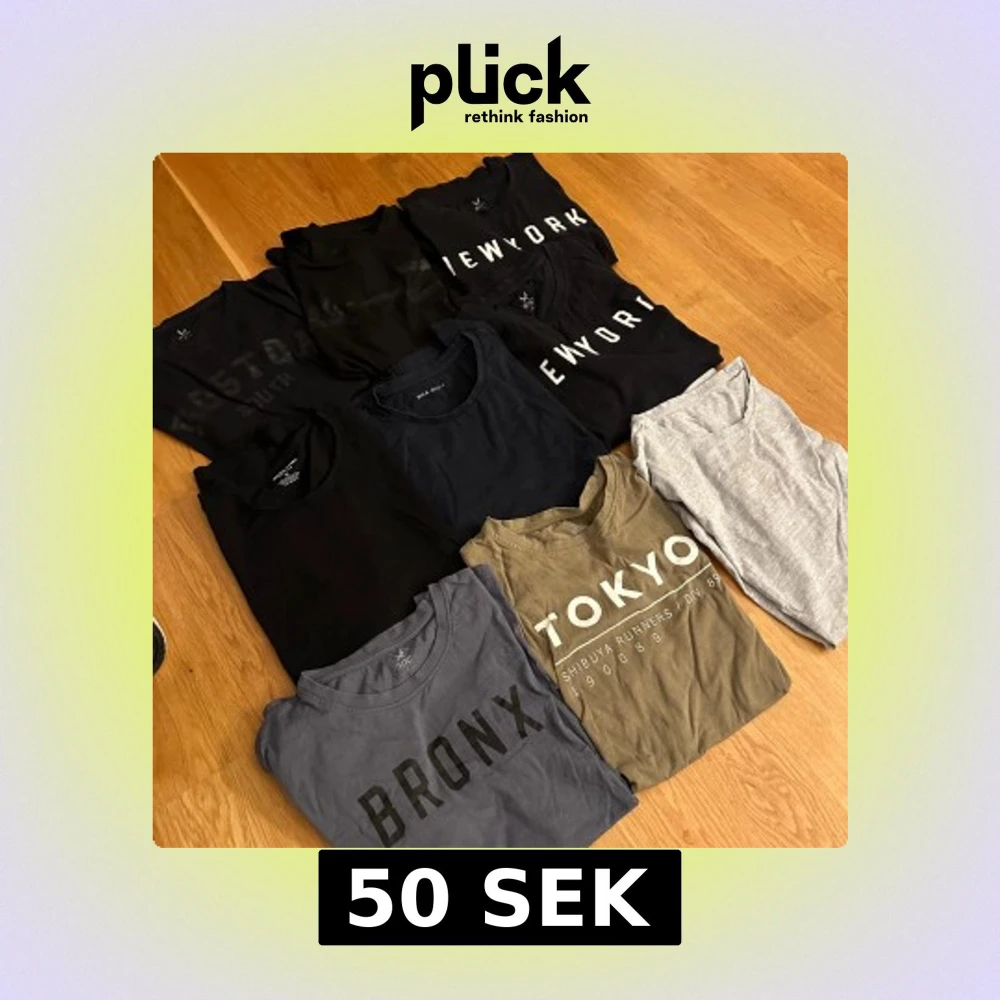Säljer ett paket med åtta t-shirts i olika färger och med coola tryck som NEW YORK, TOKYO och BRONX. T-shirtsen är kortärmade och i mjuk bomull, perfekta för en avslappnad streetstyle. Färgerna är svart, grå, blå, olivgrön och ljusgrå. Några storlek M och några S. 50kr styck