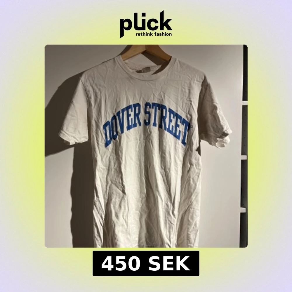 Säljer en vit t-shirt från Better Gift Shop med blå text 'Dover Street' på framsidan. Tillverkad i 100% bomull och tryckt i Nordamerika. Nypris var 950 kr