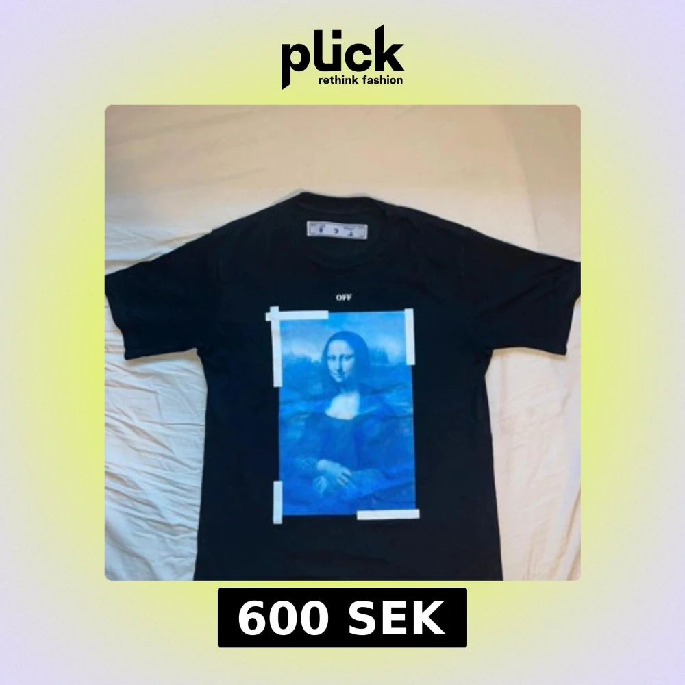 Snygg svart t-shirt från Off-White med ett stort blått Mona Lisa-tryck på framsidan och ikoniska vita pilar på baksidan. Perfekt för dig som vill ha en unik och stilren look. Passar bra till både jeans och sneakers.