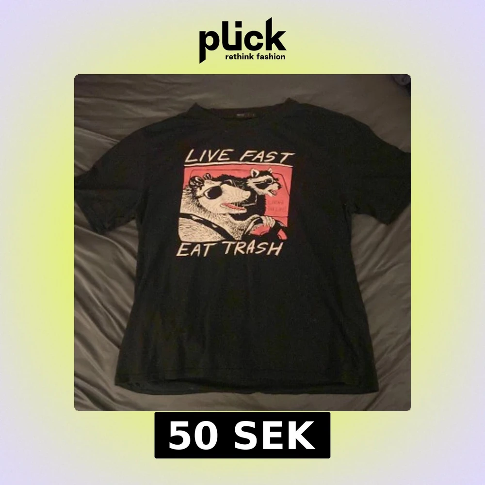 Svart t-shirt från Romwe med ett stort tryck på framsidan av två tvättbjörnar med solglasögon och texten 'LIVE FAST EAT TRASH' i vitt och rosa. Klassisk passform och rund halsringning.