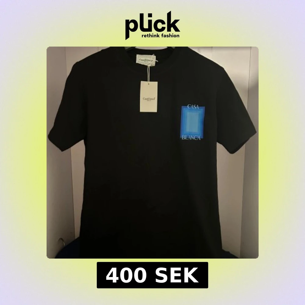 Säljer en sällsynt svart t-shirt från Casablanca med ett blått grafiskt tryck och texten 'Casa Blanca' på bröstet och ryggen. T-shirten har rund hals och är kortärmad. Perfekt för dig som gillar stilrena plagg med en twist.