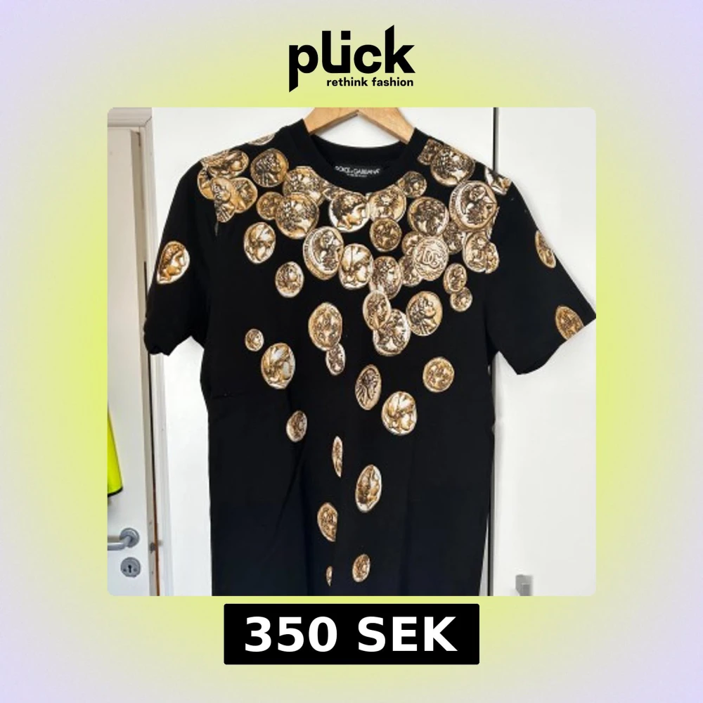 Svart t-shirt från Dolce & Gabbana med unikt tryck av antika guldmynt över hela plagget, både fram och bak. Klassisk rund halsringning och korta ärmar. Snygg statement-piece med lyxig vibe, perfekt för dig som vill sticka ut.