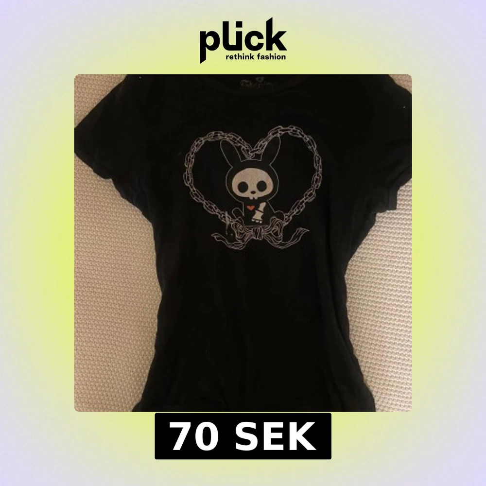 Svart t-shirt med korta ärmar och tryck av en söt kanin med dödskalleansikte inramad av ett hjärta i kedjor. T-shirten har en smal passform och är perfekt för dig som gillar alternativ stil. Materialet känns mjukt och bekvämt. Köpt i USA på Hot Topic och använd ett par gånger.
