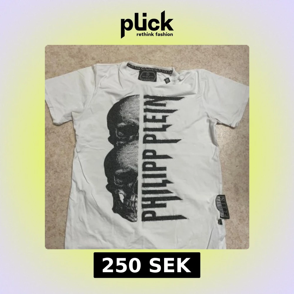 Säljer en vit t-shirt från Philipp Plein med stort svart döskalletryck och logga framtill. T-shirten har rund halsringning och korta ärmar. Perfekt för dig som gillar statement-plagg och streetstyle.