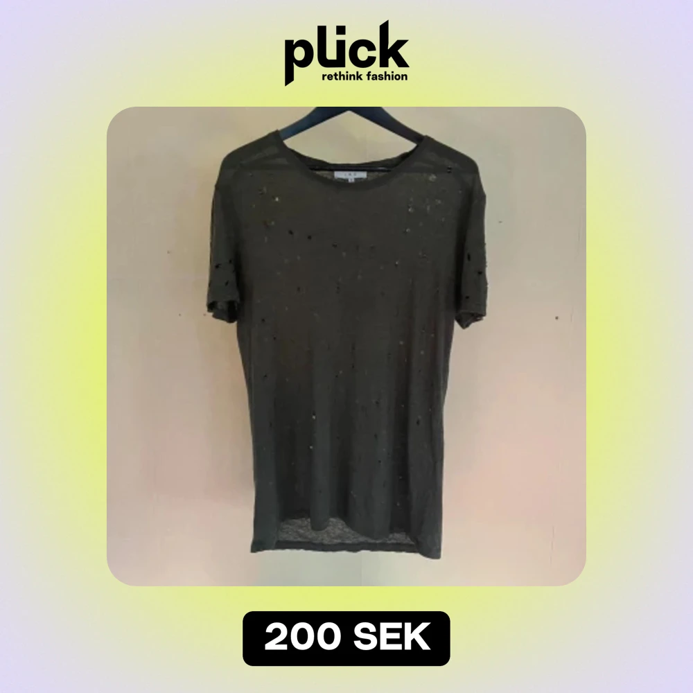 En grön (grå?) t-shirt från franska märket IRO i storlek M (Herr). Unisex präglad. T-shirten är av 100% linne och har ett slitet ”distressed” utseende med små hål men trots är den utan tvekan i ett fint skick. linen. Unisex. -Material: 100% linen -