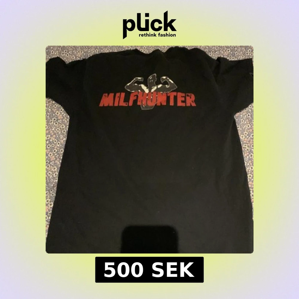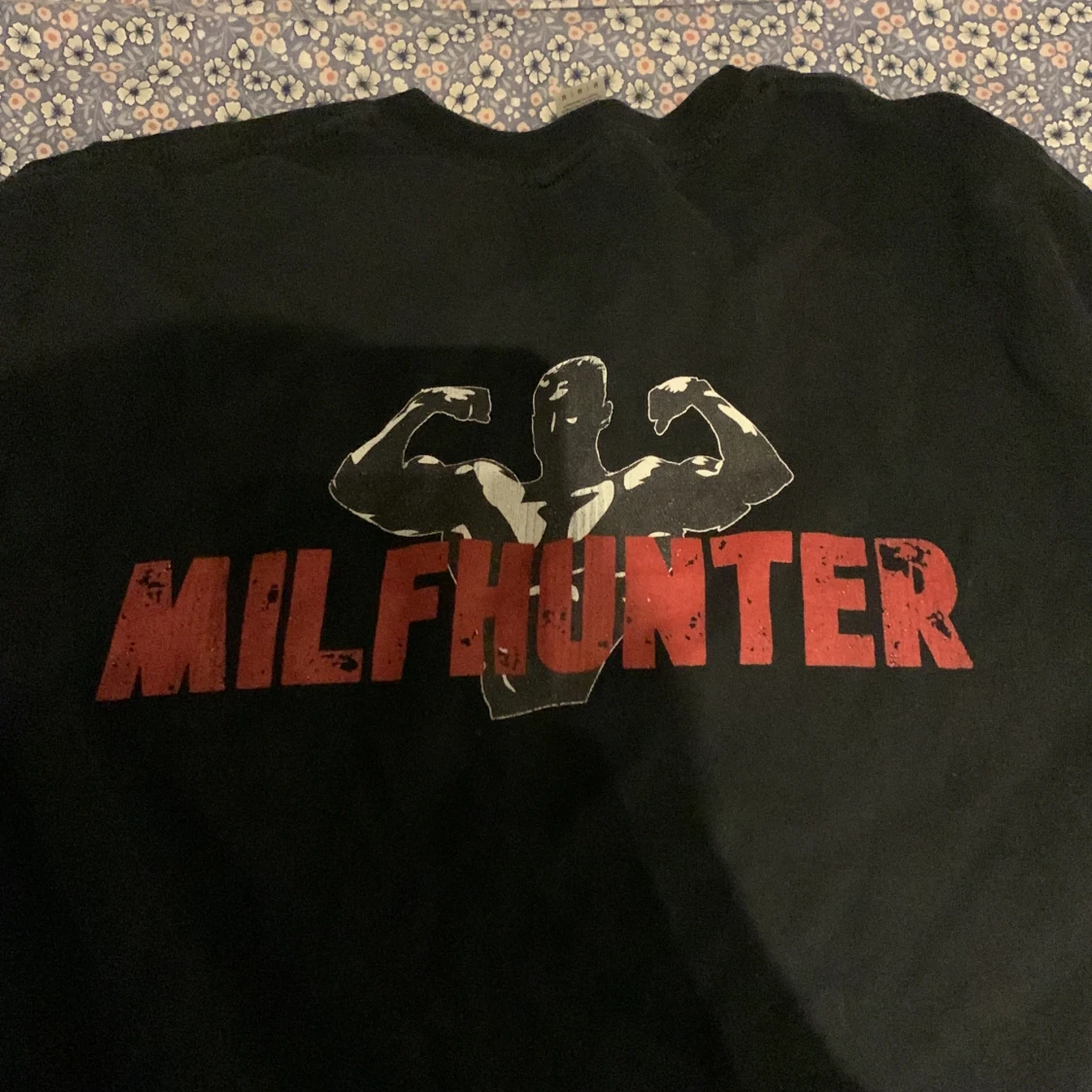 Svart t-shirt med stort rött MILFHUNTER-tryck och en siluett av en muskulös person som flexar på bröstet. Klassisk passform och rund halsringning. Perfekt för dig som vill sticka ut med en bold statement-tee.