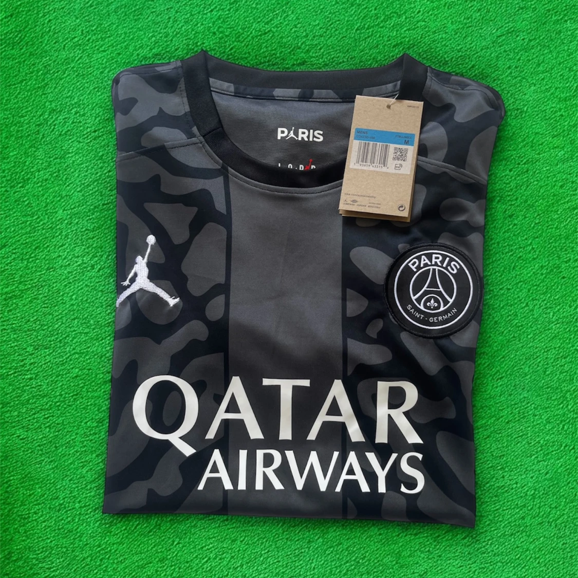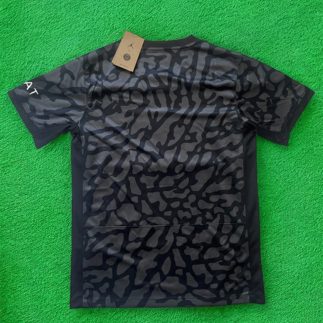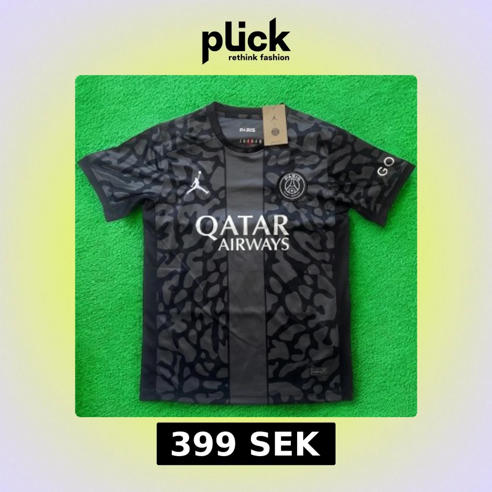 Snygg svart PSG fotbollströja i samarbete med Jordan. Tröjan har korta ärmar, coolt kamouflagemönster och stora loggor från både PSG och Jordan på bröstet. Tillverkad i lätt och ventilerande material, perfekt för match eller träning.