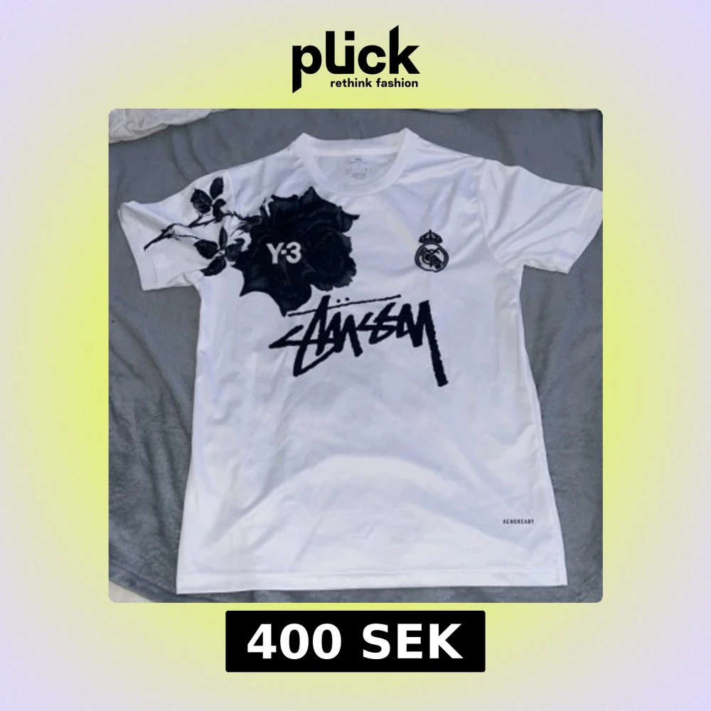 Snygg vit t-shirt med svart rosprint fram och bak, Y-3 och Real Madrid-logga samt Stüssy-grafik på bröstet. Tillverkad i lätt polyester med Aeroready-teknologi. Perfekt för dig som gillar streetwear och unika samarbeten.