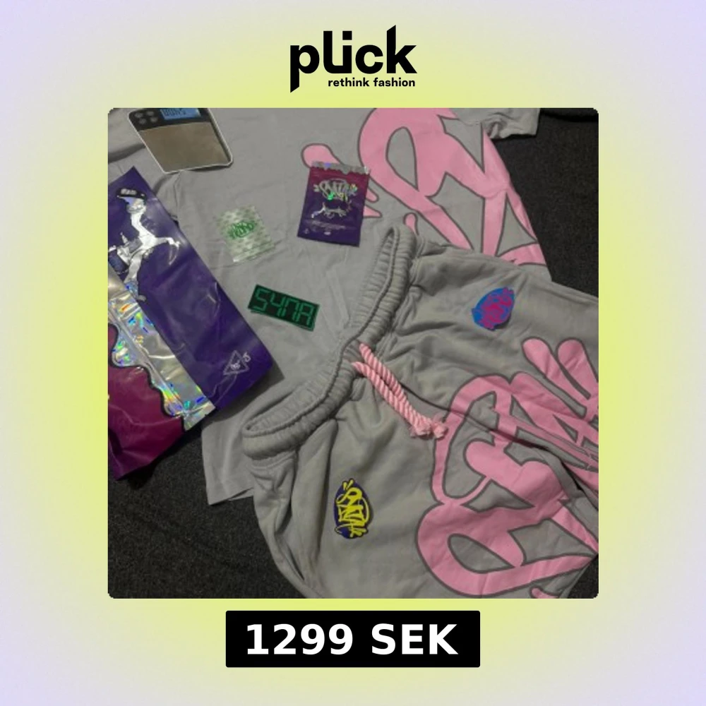 Snygg grå t-shirt från Syna med stort rosa graffiti-tryck över hela framsidan och coola färgdetaljer i gult och grönt. T-shirten har rund hals och korta ärmar, perfekt för dig som gillar streetwear och unika prints.
