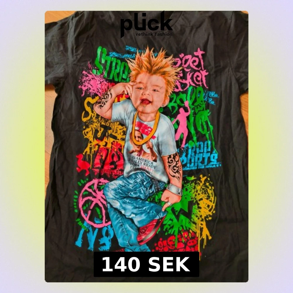 Cool svart t-shirt med stort tryck av en tecknad kille med spretigt hår, tatueringar och streetkläder. Färgglada graffiti-liknande detaljer i grönt, rosa, blått, gult och rött. Klassisk passform och korta ärmar, perfekt för dig som gillar streetstyle.
