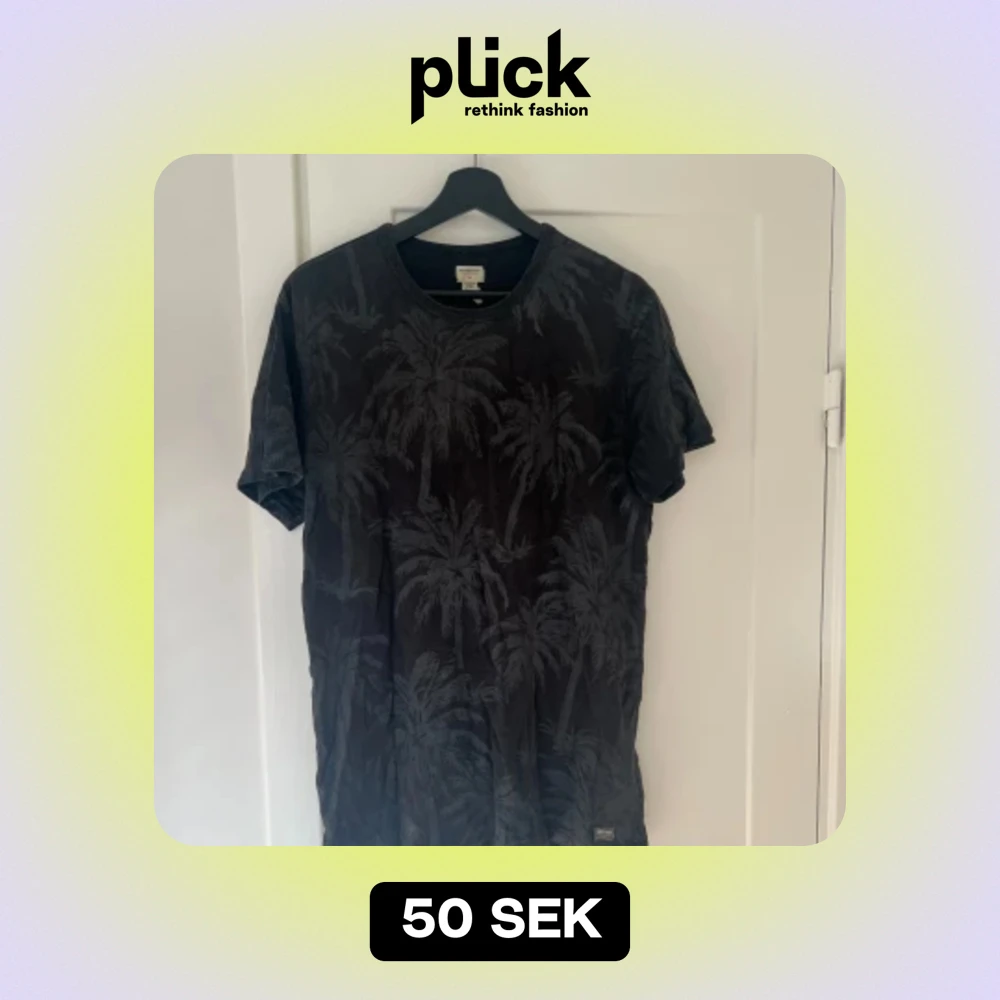 Säljer en svart t-shirt från Denim & Supply Ralph Lauren med ett coolt palmmönster. Den är i storlek M och gjord av 100% bomull, vilket gör den superbekväm. Perfekt för en avslappnad sommarlook!