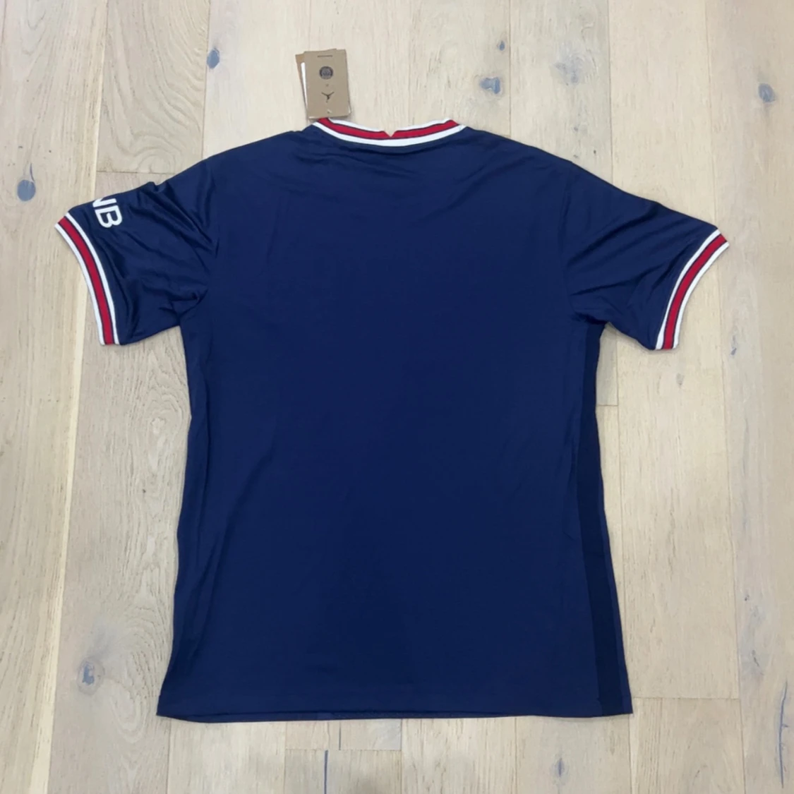Snygg PSG fotbollströja i marinblått med vita och röda detaljer på krage och ärmslut. Tröjan har korta ärmar, rund hals och PSG-logga på bröstet. Tillverkad i lätt och ventilerande polyester, perfekt för match eller träning.
