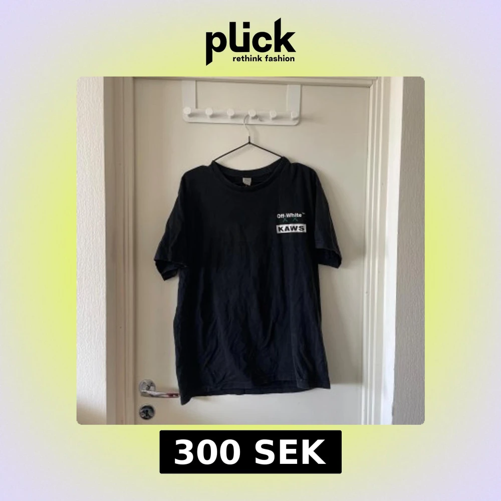 Svart t-shirt från Off-White x KAWS med tryck på bröstet och stor grön KAWS-figur på ryggen. Klassisk passform, rund hals och coola vita detaljer. Perfekt för dig som gillar streetwear och unika samarbeten.