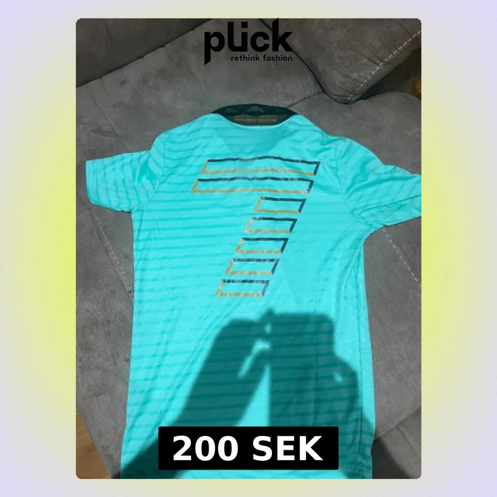 Snygg turkos t-shirt från EA7 Emporio Armani med guldiga detaljer och tryck. T-shirten har en klassisk krage med mönster, korta ärmar och subtila ränder i tyget. Stor siffra 7 på ryggen och logga framtill ger en sportig vibe.