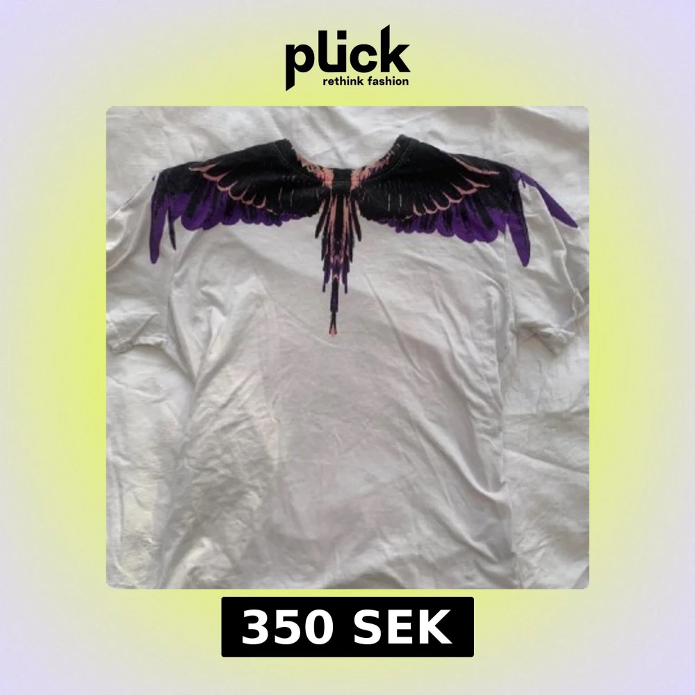 Säljer en vit Marcelo burlon t-shirt med ett unikt vingmönster i svart och lila över axlar och hals. T-shirten har rund halsringning och korta ärmar och så är inte priset fast och kan diskuteras vid snabb affär. Perfekt för dig som vill sticka ut med en cool design!