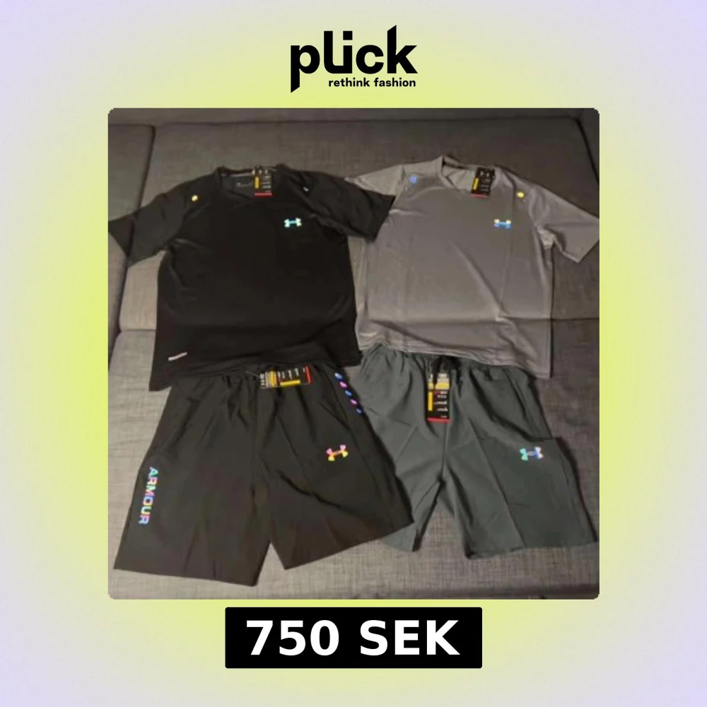 Två sportiga under armour Sets. (T-shirt och shorts) från Under Armour i svart och grått. Båda har korta ärmar och det ikoniska Under Armour-logotypen på bröstet som även har reflex. Perfekta för alla möjliga dagar men speciellt sommardagar. Glöm inte att ETT sett går för priset vi lagt, inte båda! Några frågor?tveka absolut inte på att höra av er.