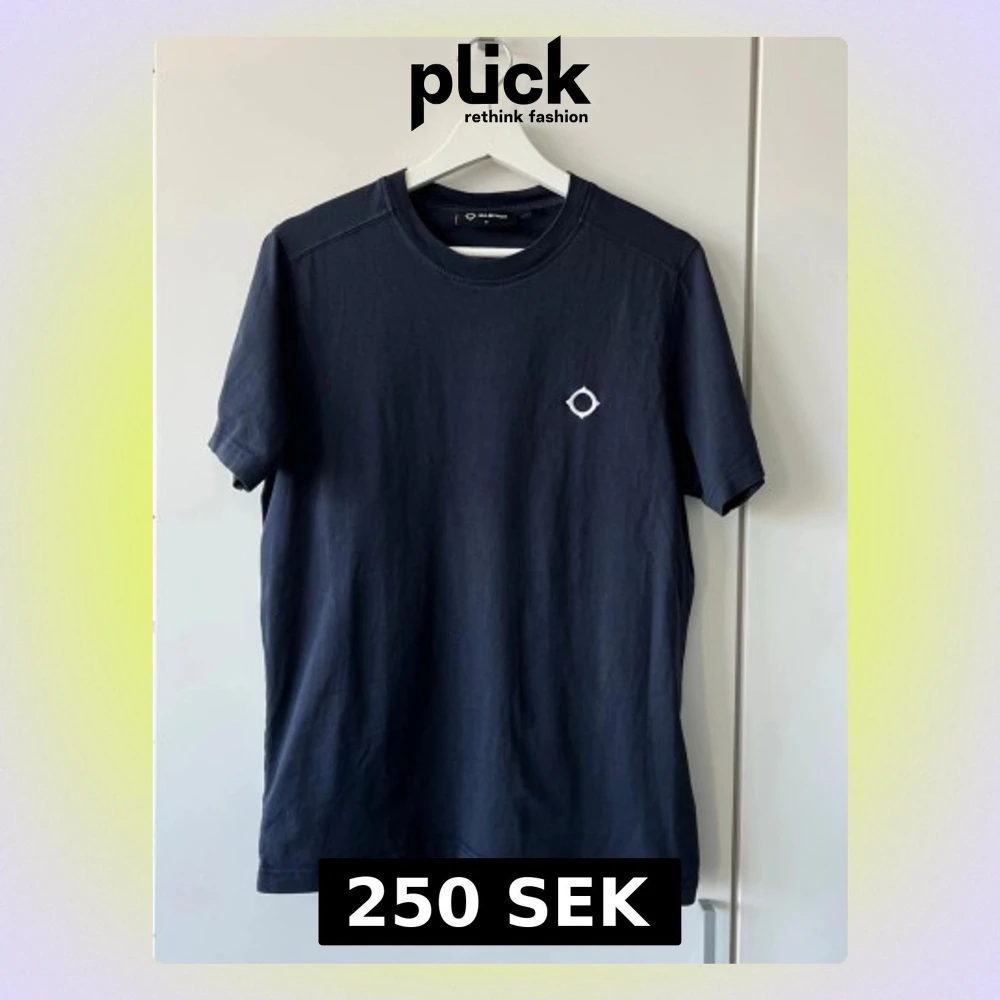 Mörkblå t-shirt från MA.STRUM med liten vit logga på bröstet. Tillverkad i 100% bomull. Nypris: 85£