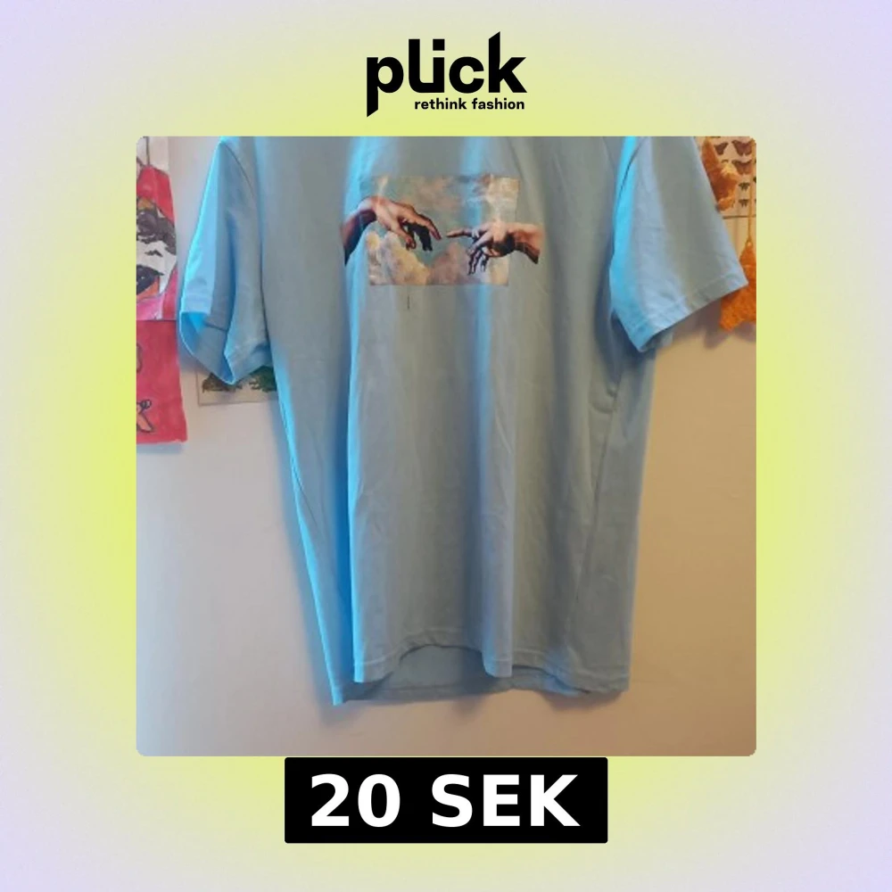 (Gammal tröja, köoer inte från SHEIN längre) Säljer en ljusblå t-shirt med ett tryck framtill som föreställer två händer i en konstnärlig stil, inspirerat av Michelangelos 'Skapelsen av Adam'. T-shirten har normal passform och korta ärmar. Perfekt för dig som gillar unika tryck! Christian printed shirt, graphic print, hip-hop style, men's graphics tee, unisex graphic tee, streetstyle t-shirt, koszula