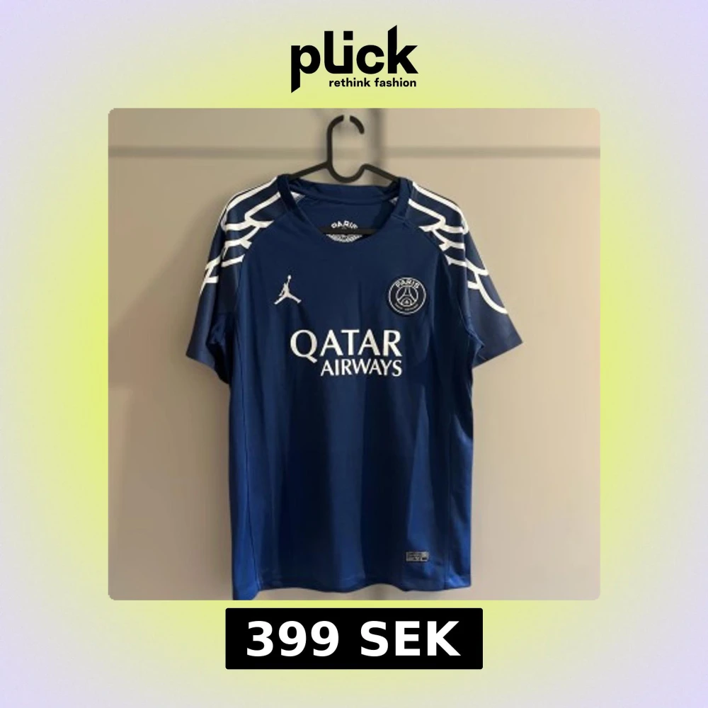 Snygg marinblå PSG fotbollströja med vita detaljer och tryck från Qatar Airways. Tröjan har korta ärmar, coolt vitt mönster på axlarna och Paris Saint-Germain-logga på bröstet. Tillverkad i lätt och ventilerande material, perfekt för match eller träning.