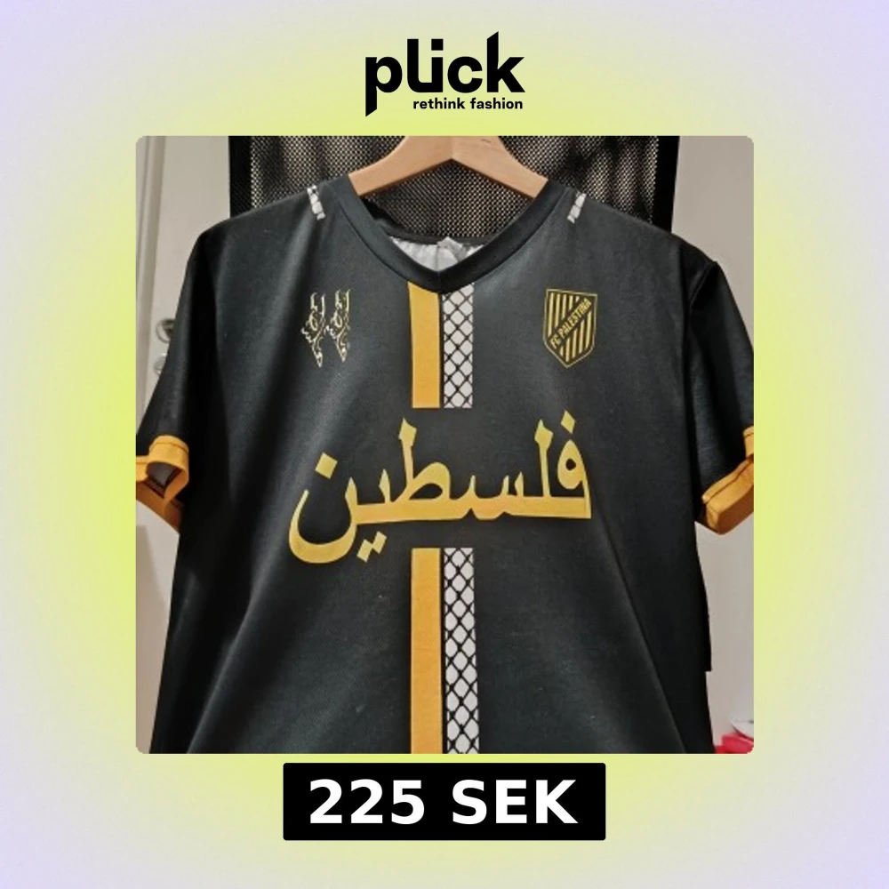 Svart fotbollströja med gula detaljer och tryck från FC Palestina. Tröjan har korta ärmar, V-ringning och unika grafiska tryck på både fram- och baksida, inklusive arabiska bokstäver och kartmotiv. Tillverkad i lätt och ventilerande syntetmaterial.