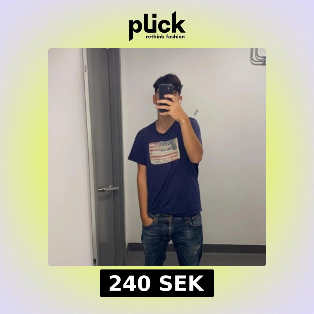 Säljer en mörkblå t-shirt med ett tryck av en amerikansk flagga på bröstet. T-shirten har en avslappnad passform och är perfekt för en casual look. Passar bra till jeans eller shorts.