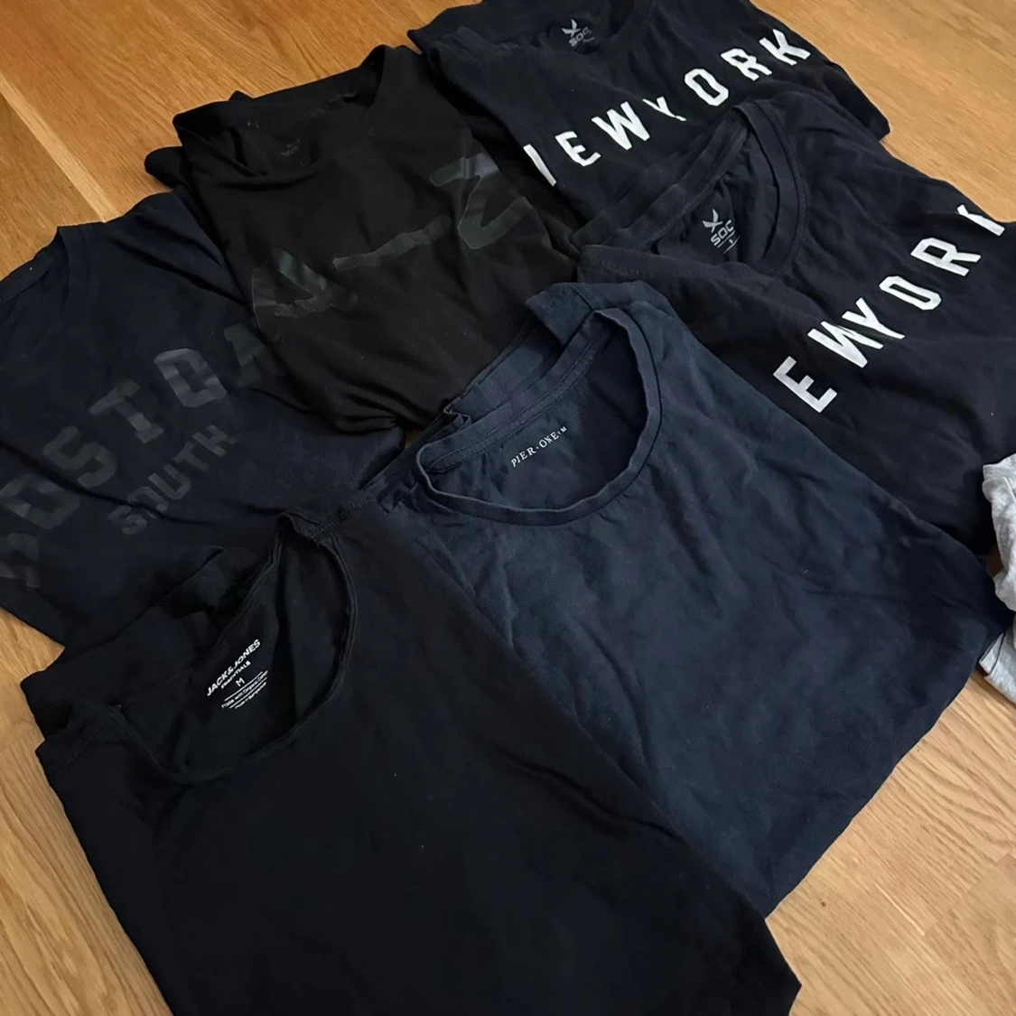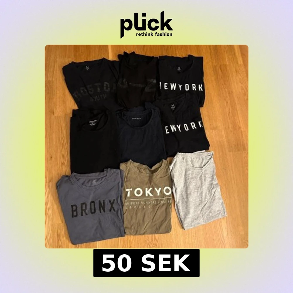 Säljer ett paket med t-shirts i olika färger och tryck, bland annat med texten NEW YORK, TOKYO, BOSTON och BRONX. Färgerna är svart, grå, blå, olivgrön och ljusgrå. Alla är kortärmade och i mjuk bomull, vissa med rund hals och enkla tryck framtill. Har AZ tröja och Jack N Jones tröja också.