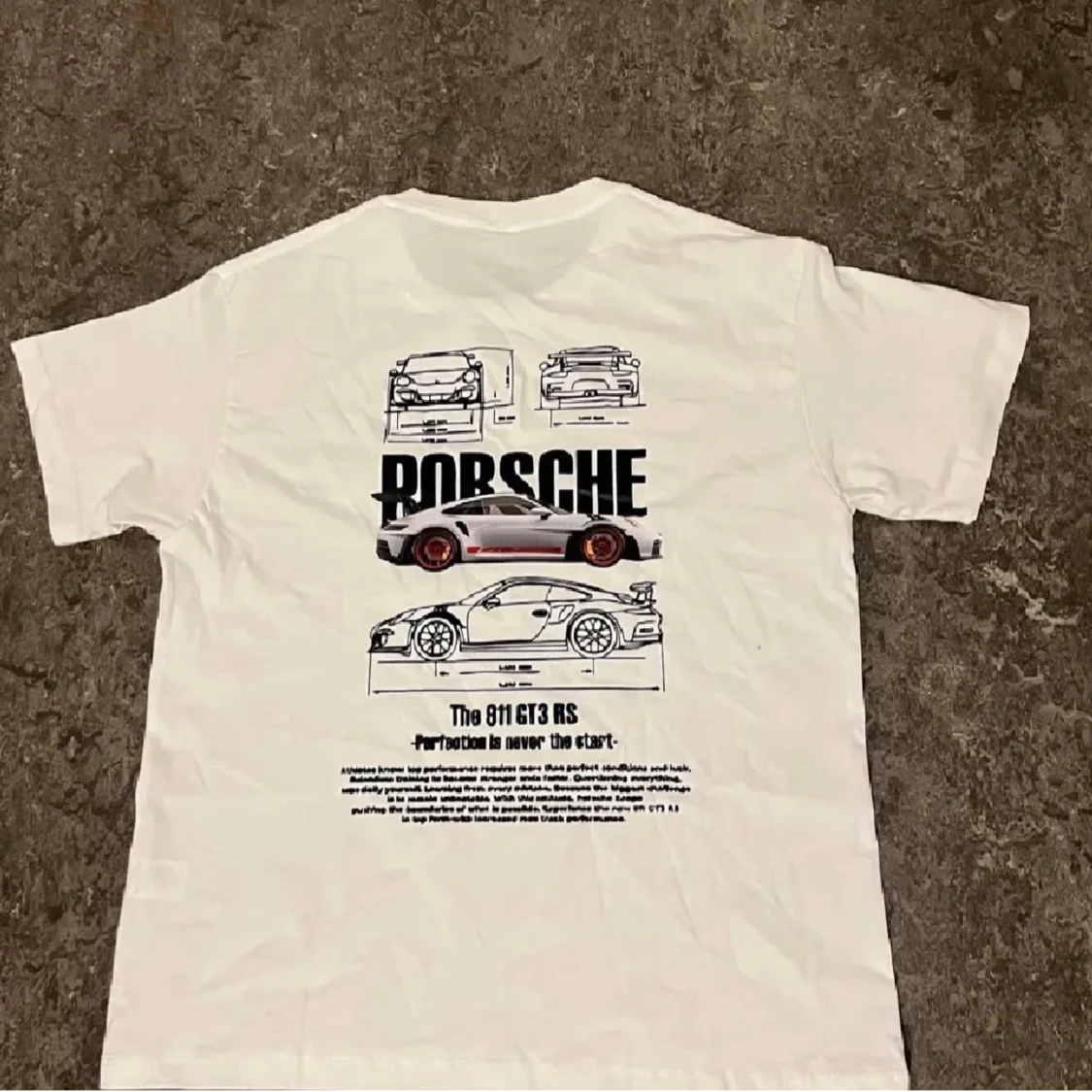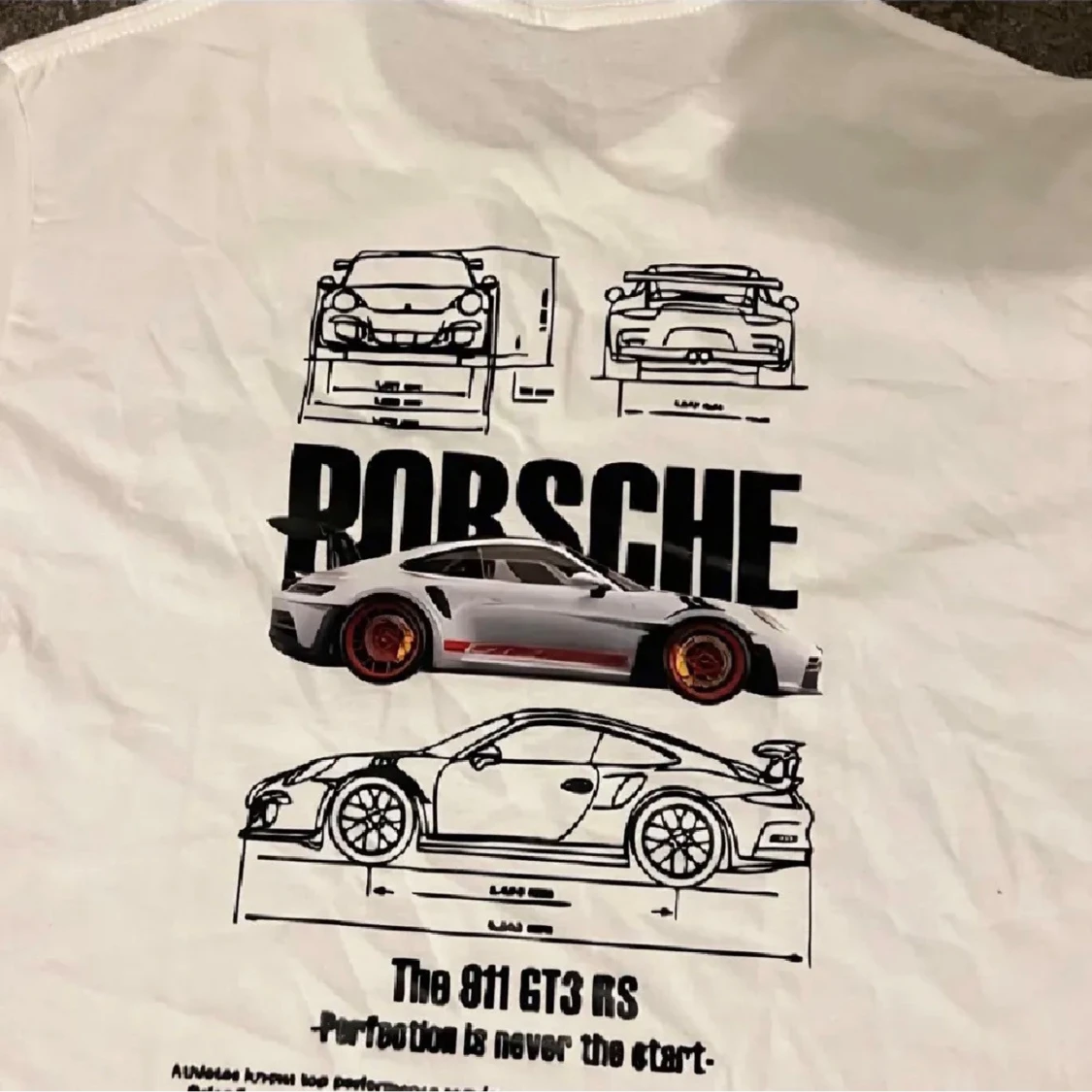 Vit t-shirt med tryck av Porsche 911 GT3 RS på ryggen. Stora svarta bokstäver, detaljerade bilskisser och färgglad bilgrafik gör den riktigt snygg. Klassisk passform med rund hals och korta ärmar. Perfekt för dig som älskar bilar och motorsport.