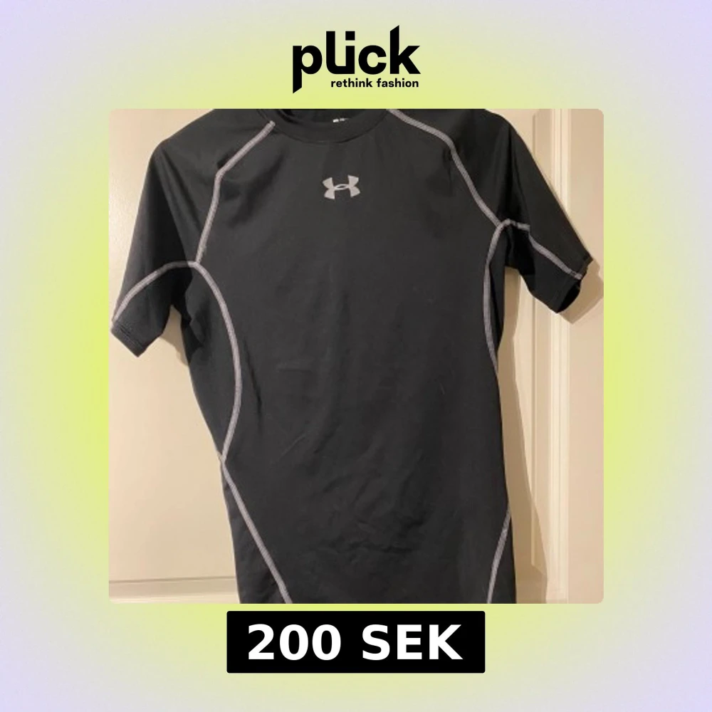 Säljer en svart kompressionströja från Under Armour med korta ärmar och grå sömmar. Perfekt för träning med HeatGear-teknologi som håller dig sval och torr. Logotypen syns både fram och bak. Passar dig som vill ha en tight passform.