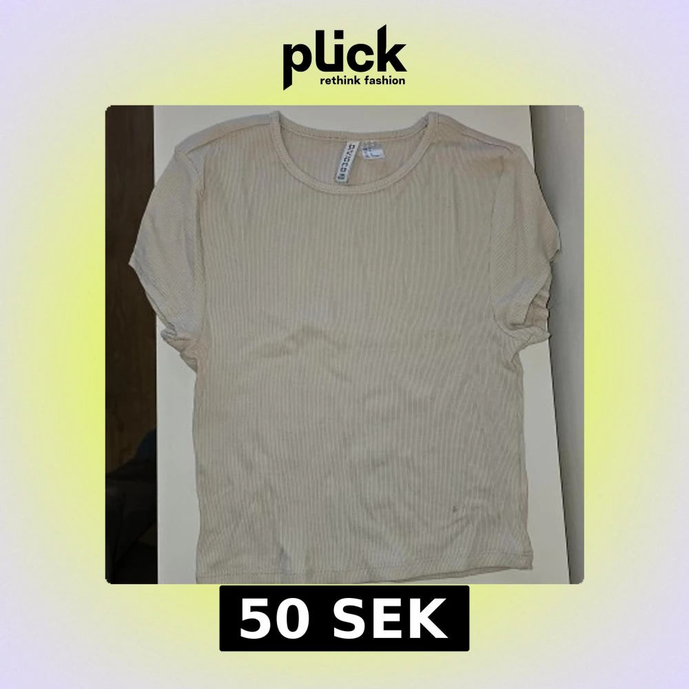 Säljer en beige ribbad t-shirt från H&M Divided. Den är kortärmad och tillverkad i en mjuk bomullsblandning med elastan för extra komfort. Perfekt för en avslappnad stil.