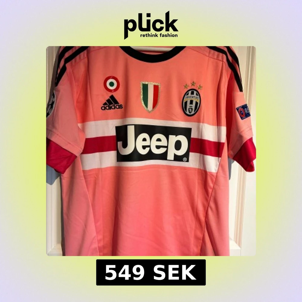 Juventus bortatröja i rosa med svarta och röda detaljer, Adidas-logga och Jeep sponsortryck. Pogba 10 på ryggen. Utrustad med Champions League och UEFA Respect patchar på ärmarna. Rund hals och korta ärmar.