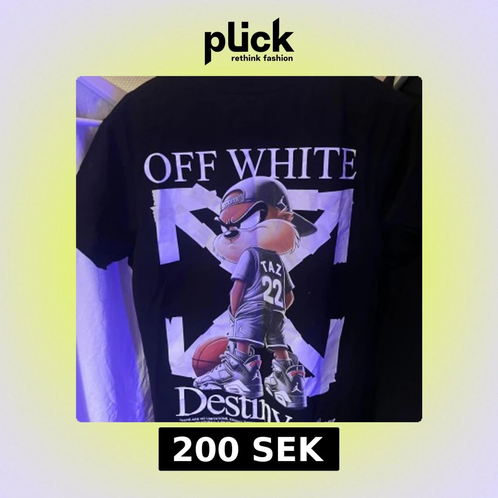 Säljer en svart t-shirt från Off-White med stor grafisk print på ryggen av Taz i basketkläder och sneakers, samt Off-White-logga fram. T-shirten har korta ärmar och är gjord i mjuk bomull. Perfekt för dig som gillar streetwear och coola motiv.