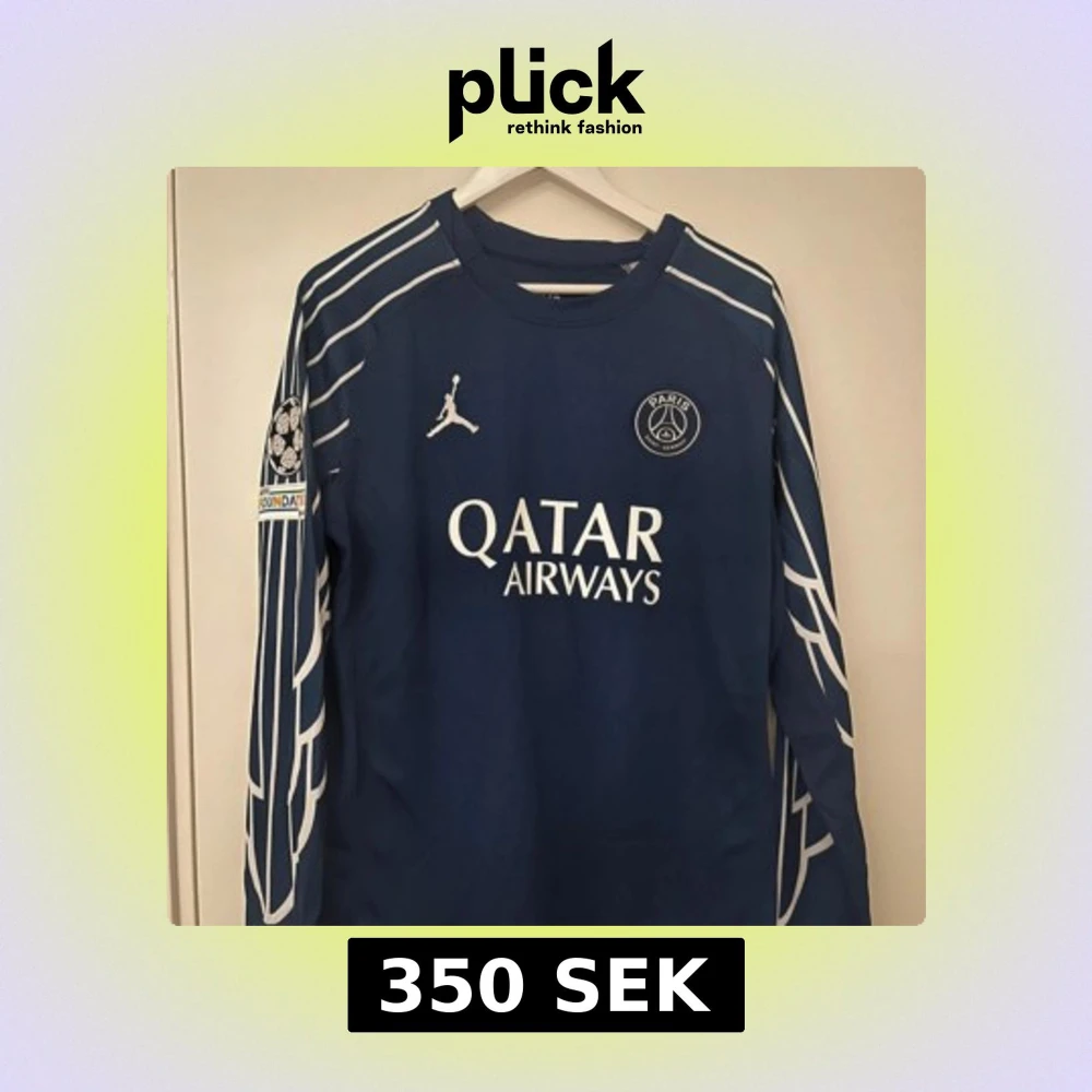Snygg blå PSG långärmad fotbollströja med vita detaljer, Dri-Fit-material och O. Dembélé #10 på ryggen. Jordan-logga, Qatar Airways-tryck och Champions League-märke på ärmen. Perfekt för dig som älskar fotboll och vill sticka ut på läktaren.