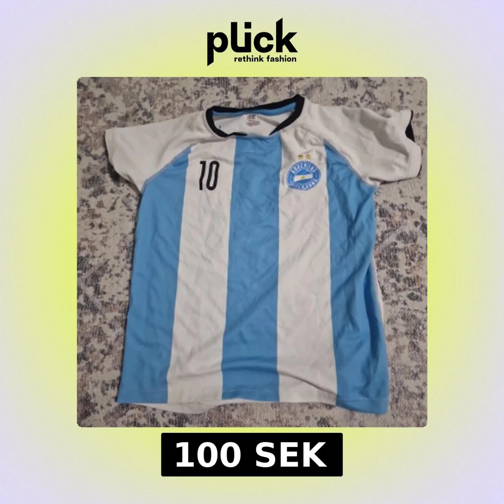 Säljer en klassisk Argentina fotbollströja från H&M Sport i storlek M. Tröjan har blå och vita vertikala ränder, svart nummer 10 på bröstet och ryggen samt Argentina-emblem med två stjärnor. Rund hals med svart och blå kant. Materialet är lätt och andas.