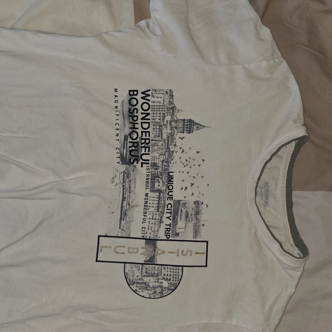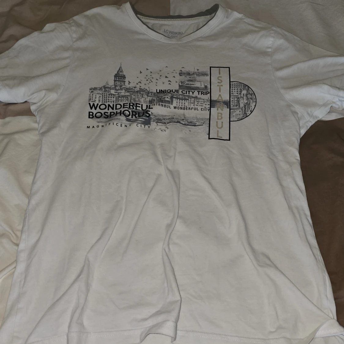 Säljer en vit t-shirt från LC Waikiki med ett coolt Istanbul-tryck. T-shirten har korta ärmar och en rund halsringning med grå kant. Perfekt för en avslappnad stil.