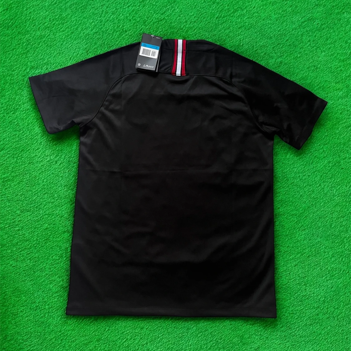 Svart PSG fotbollströja med korta ärmar, tillverkad i lätt och ventilerande material. Framsidan har vit vertikal rand, broderad PSG-logga och Jumpman-logga samt Fly Emirates-tryck. Rödvit detalj i nacken. Perfekt för dig som älskar fotboll och streetstyle.