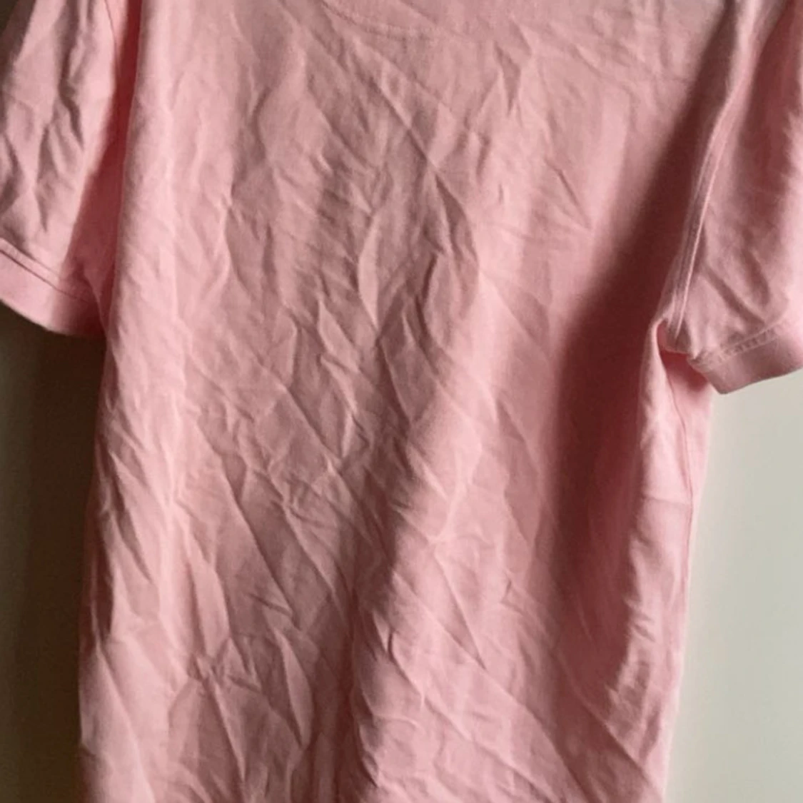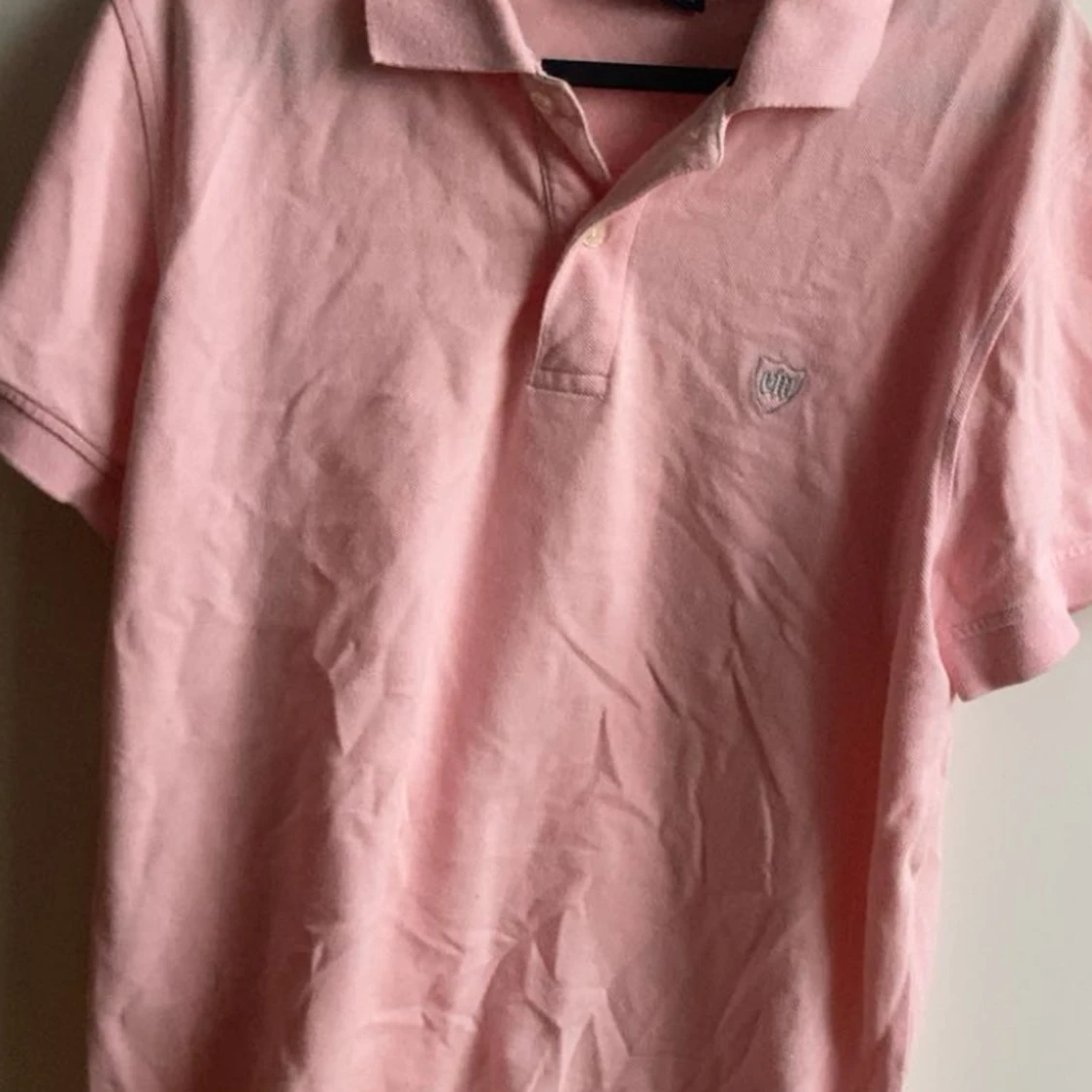Säljer en ljusrosa piké med klassisk krage och korta ärmar. Tröjan har två knappar vid halsen och en liten broderad logga på bröstet. Tillverkad i mjuk bomull, perfekt för en chill och stilren look.