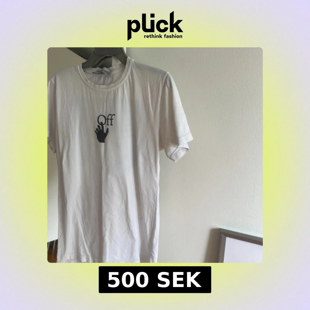 Säljer en clean vit t-shirt från Off-White i bomull, med svart hand- och texttryck på bröstet och stor grafisk logga i blått och gult på ryggen. Klassisk rund hals och korta ärmar. Perfekt för dig som gillar streetwear och vill sticka ut med snygga detaljer.