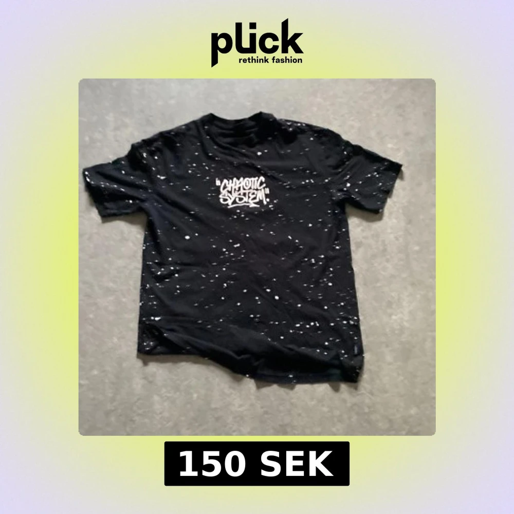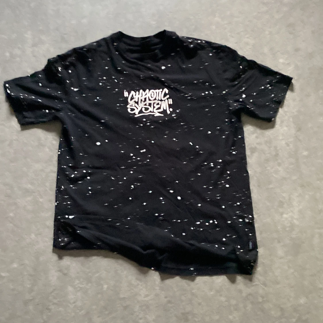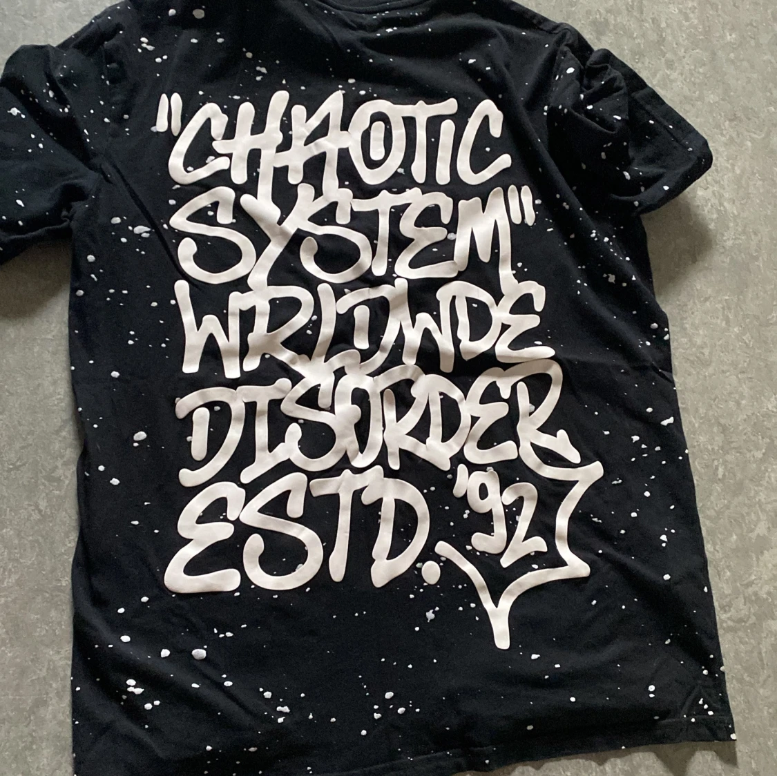 Svart t-shirt från FSBN med relaxed fit och coolt graffiti-tryck både fram och bak. T-shirten har vita stänk över hela tyget och texten 'Chaotic System' i stor stil. Perfekt för dig som gillar streetwear vibes.