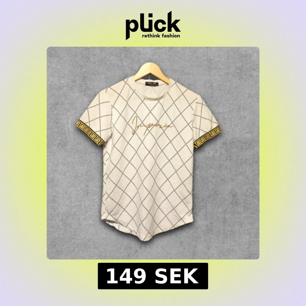 Snygg beige t-shirt från Johnny Voga med svart rutmönster och gulddetaljer på ärmsluten. T-shirten har korta ärmar och ett broderat guldigt signaturtryck på bröstet. Perfekt för dig som gillar unika detaljer och stilren design.