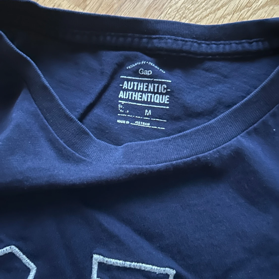 Säljer en mörkblå t-shirt från GAP med ett stort tryck av Union Jack-flaggan och GAP-loggan på framsidan. Köpt på GAP-store i London.