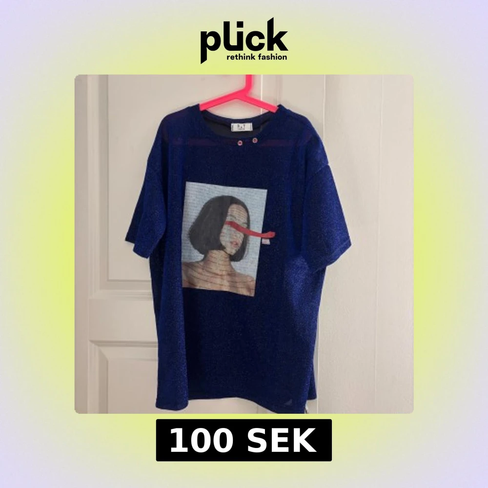Snygg blå glittrig t-shirt från X_T med ett stort konstnärligt tryck. T-shirten är transparent/mesh och har korta ärmar samt rund hals med metallöglor.