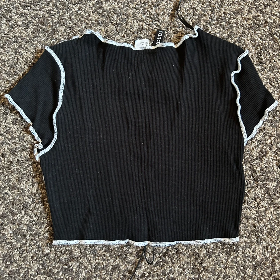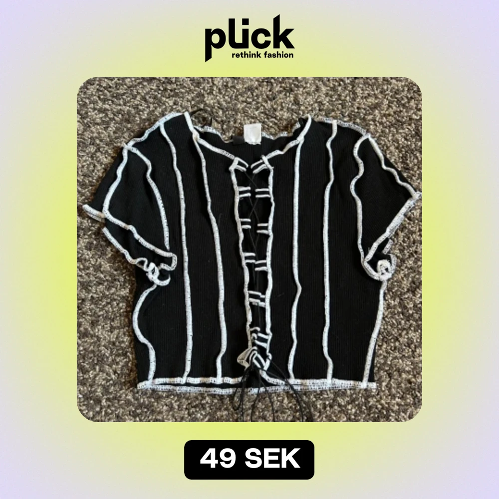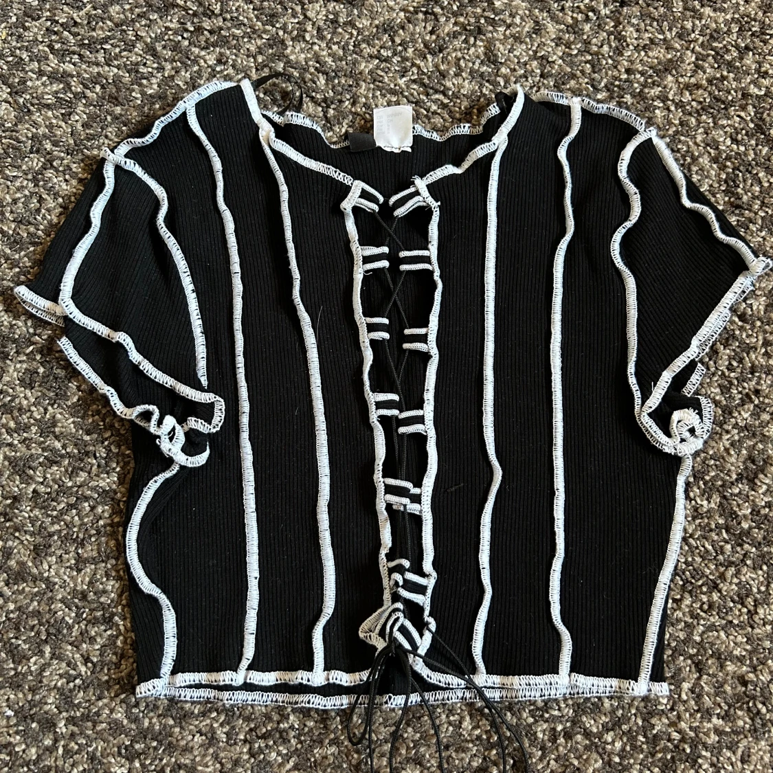 Nästan helt oanvänd. Svart magtröja med vita trådar som sticker ut mer, har svarta snören i mitten så man kan justera hur öppen tröja ska va