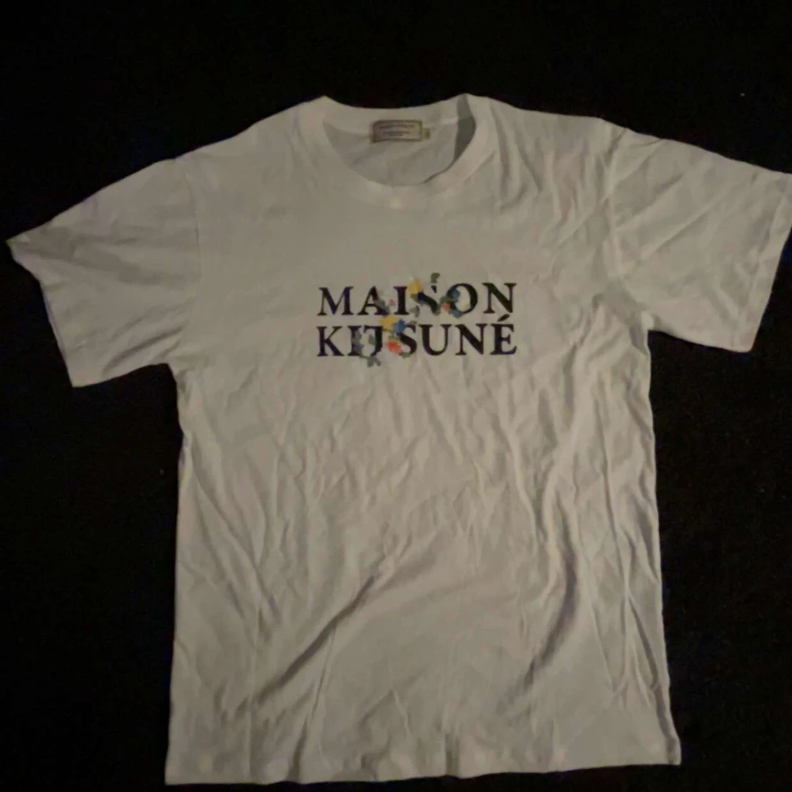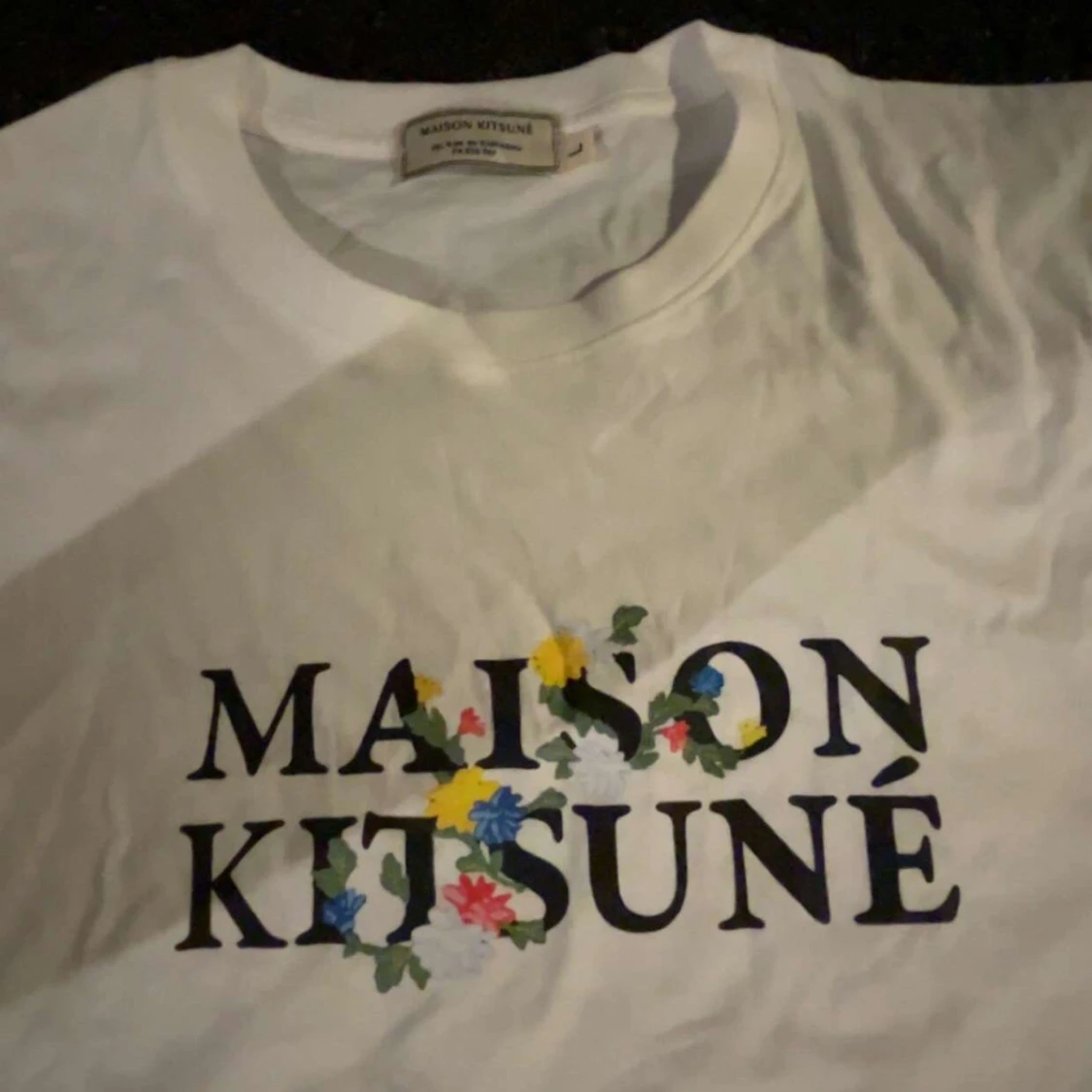 Vit t-shirt från Maison Kitsuné med svart tryck och färgglada blommor över loggan. Klassisk passform med rund hals och korta ärmar. Perfekt för dig som gillar stilrena plagg med en twist. Materialet är mjuk bomull.