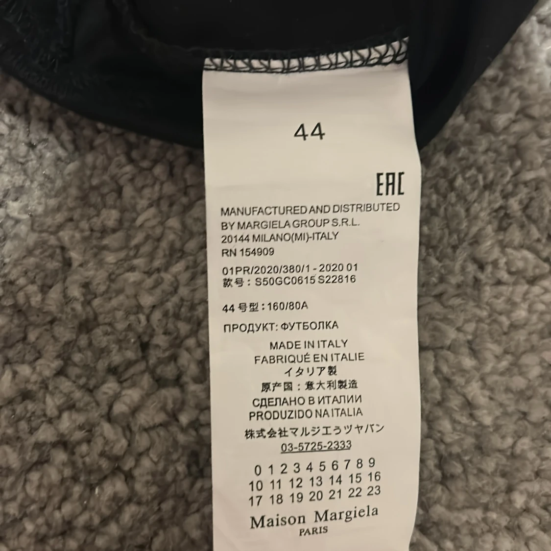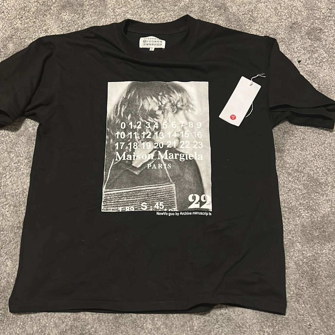 Svart t-shirt från Maison Margiela med stort grafiskt print framtill i gråskala och klassisk logga. T-shirten har rund hals. Denna t shirten är oversized för dig som gillar det tveka ej att skriva