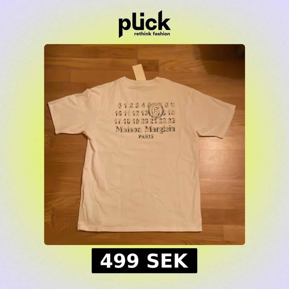 Vit t-shirt från Maison Margiela med tryck av siffror och logga på ryggen. Klassisk passform med korta ärmar och rund hals. Tillverkad i mjuk bomull, perfekt för en clean och stilren look. Renade i garderob och hitta denna, försöker bli av med den så jag kan känna ihop en slant till sommaren