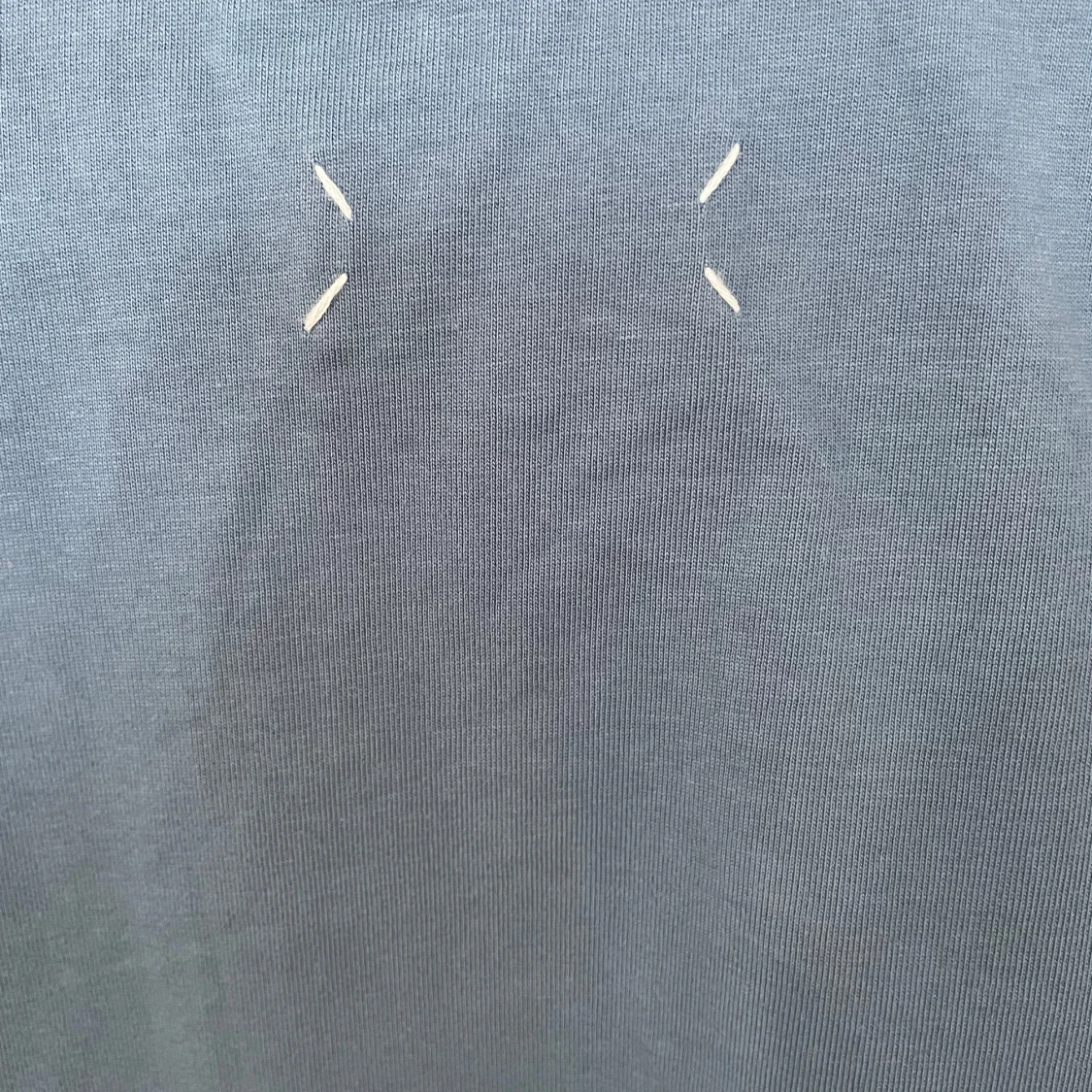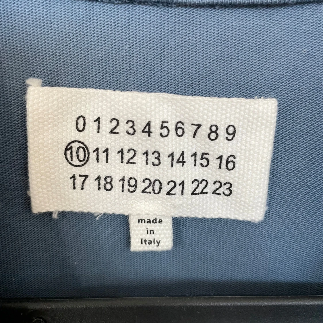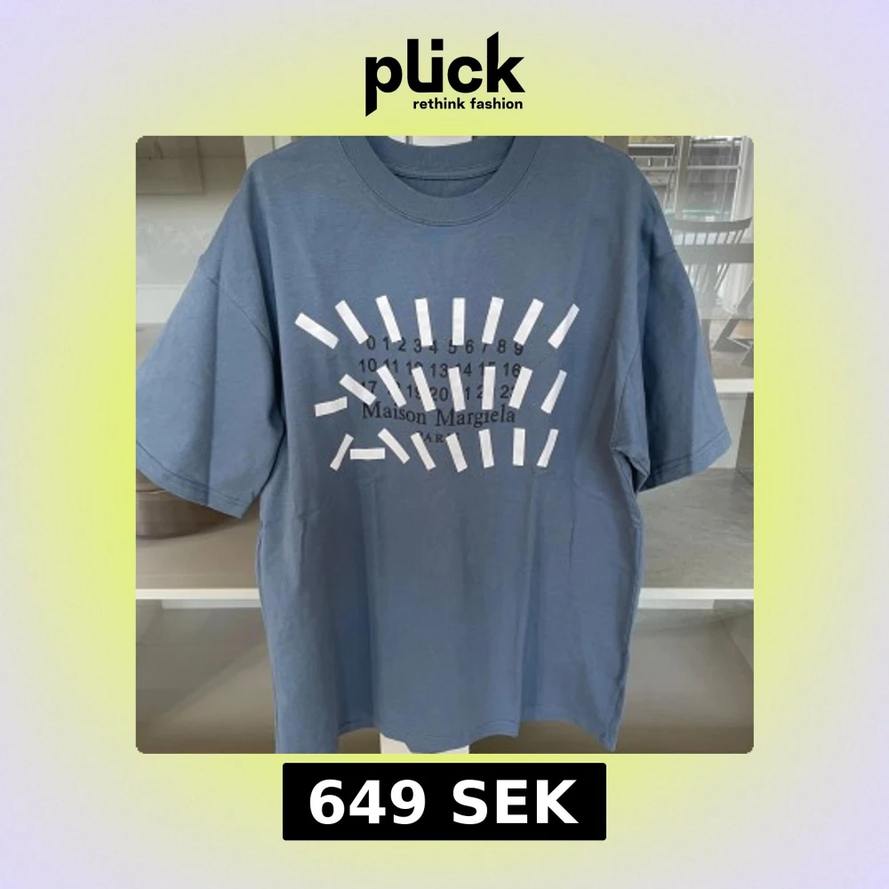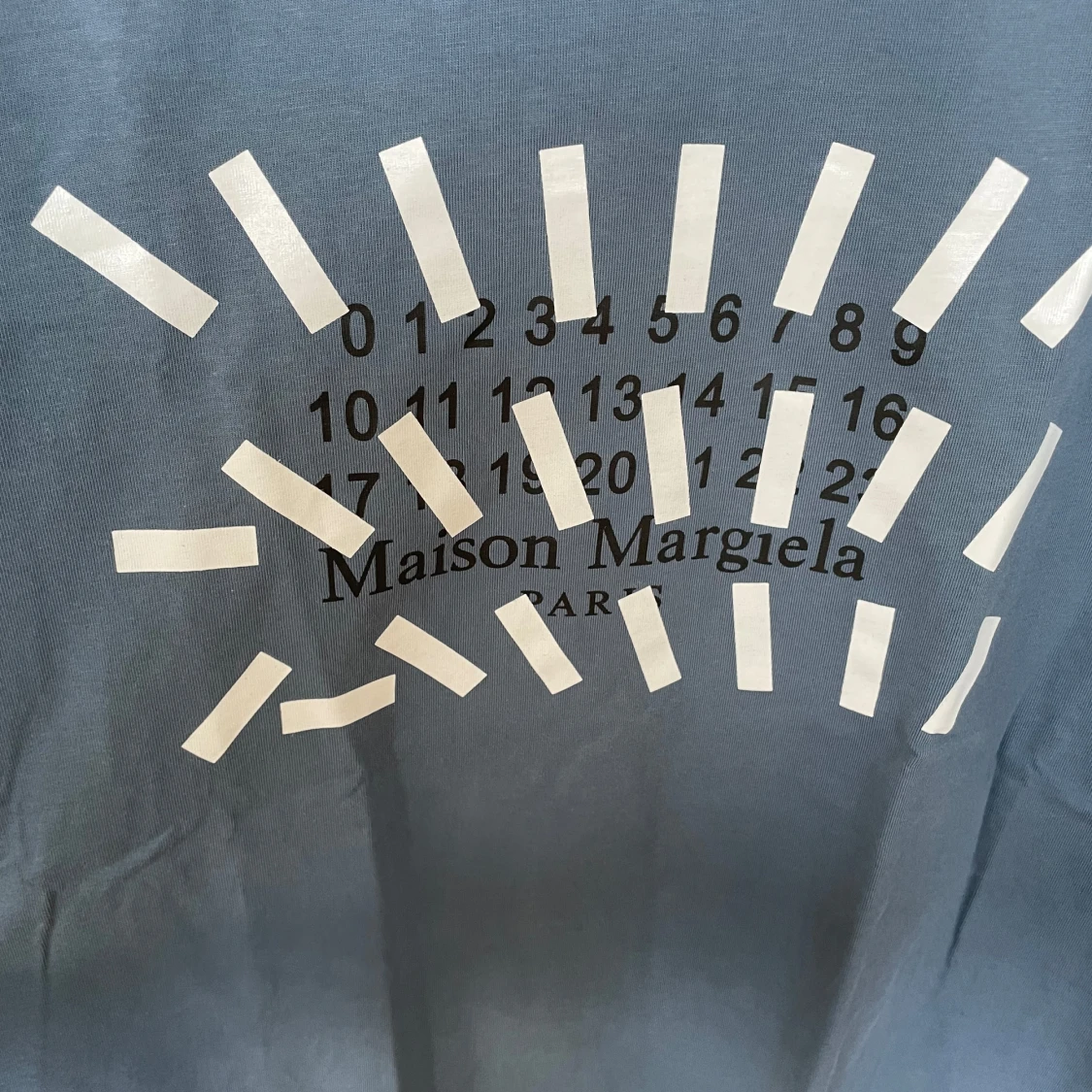 Säljer en blå t-shirt från Maison Margiela med ikoniskt tryck framtill i vitt och svart. T-shirten har rund halsringning och korta ärmar. Tillverkad i Italien och i mjuk bomull. Perfekt för dig som gillar stilrena designer med en twist.